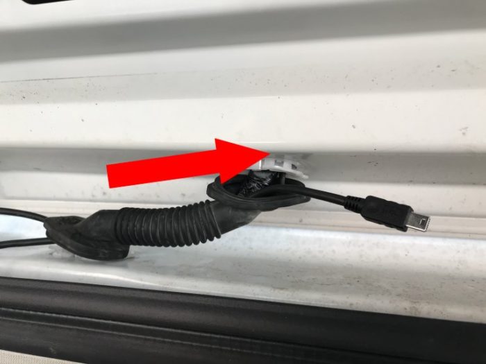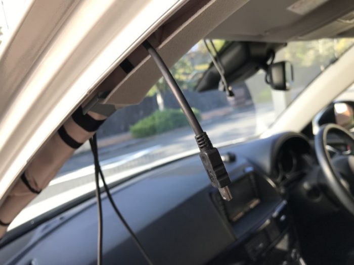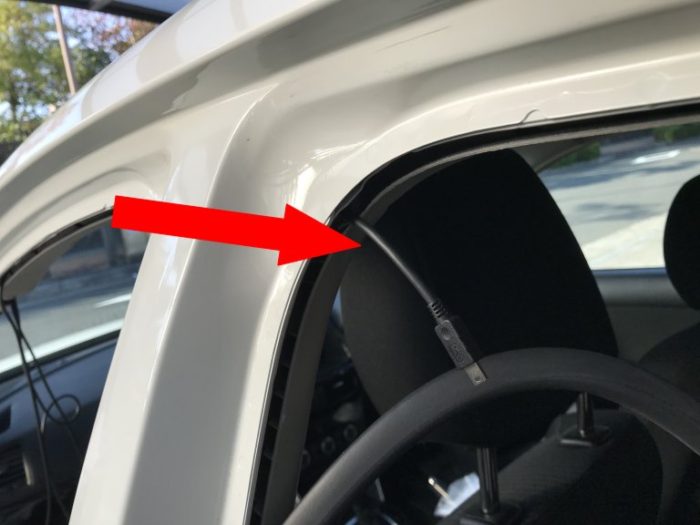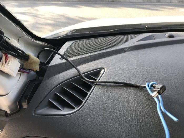 上側(ダッシュボード側)から針金を通し、ケーブルを結んで引っ張り上げると楽に通せます。