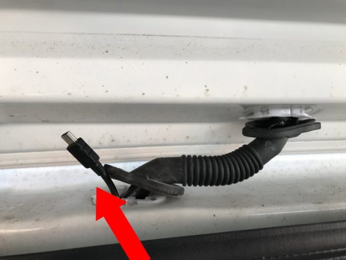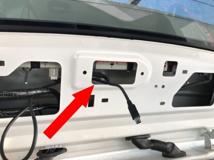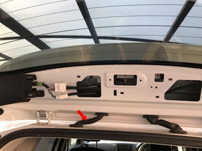 左中央ピラーを通って、さらに天井カバーの隙間も通し、そのままリアゲート上部まで通したら…