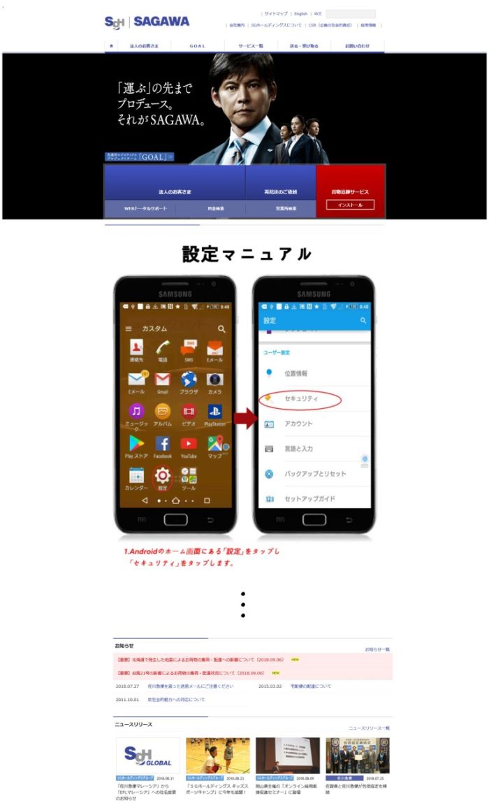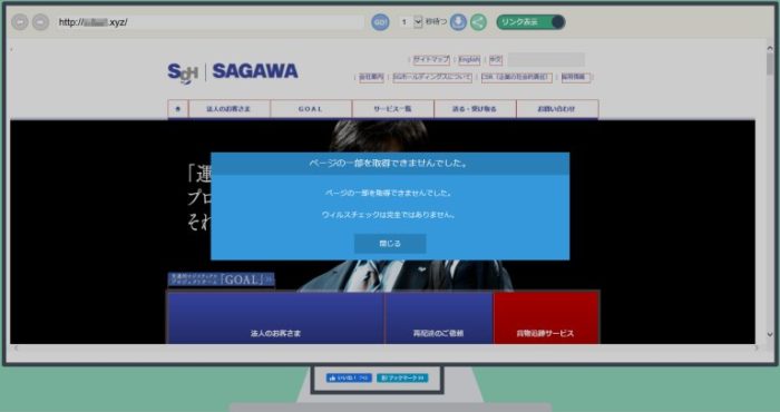 表示されるページは一見して「佐川急便」のようですが、以下の点で偽サイトであることに気付きます。