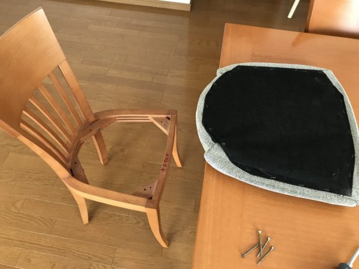 でもさすがに20年も使ってるとクッションがヘタリまくって、さすがに座り心地も悪くなります。思い出のあるチェアで永く使いたいので、リフォームしてみました。