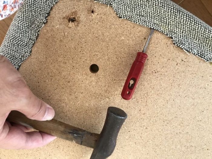 生地をタッカーで留めてあるので、ひとつずつ外します。