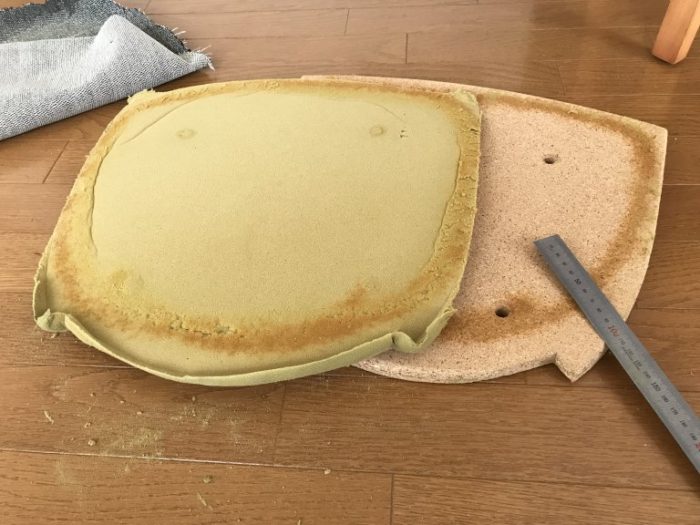 表の生地、中のウレタンマットを取り外しました。ウレタンマットと板材の間に定規を差し込むと簡単に分離できます。さすがに20年もたてばウレタンマットもヘタリまくりで、端の部分はきな粉みたいになってました…