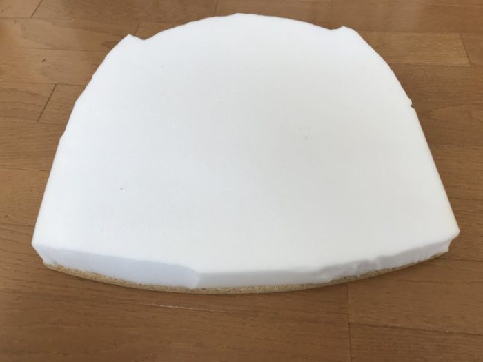 ホームセンターで購入した低反発マットを座面に合わせてカットし、接着剤で貼り合わせます。カット部分は少々ガタガタでもOK、接着剤を塗るのは座面の周囲だけでOKです。